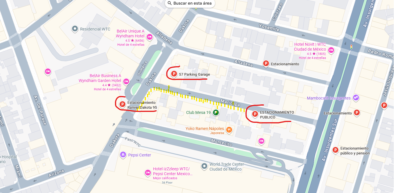 Hay tres opciones de estacionamientos muy cercanos (3 minutos caminando). Aquí te los marcamos: